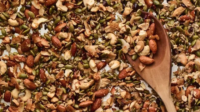 - In a large mixing bowl, stir together the coconut oil, honey, and vanilla. Add the nuts, sea salt, coconut akes, and cacao nibs and stir well.
